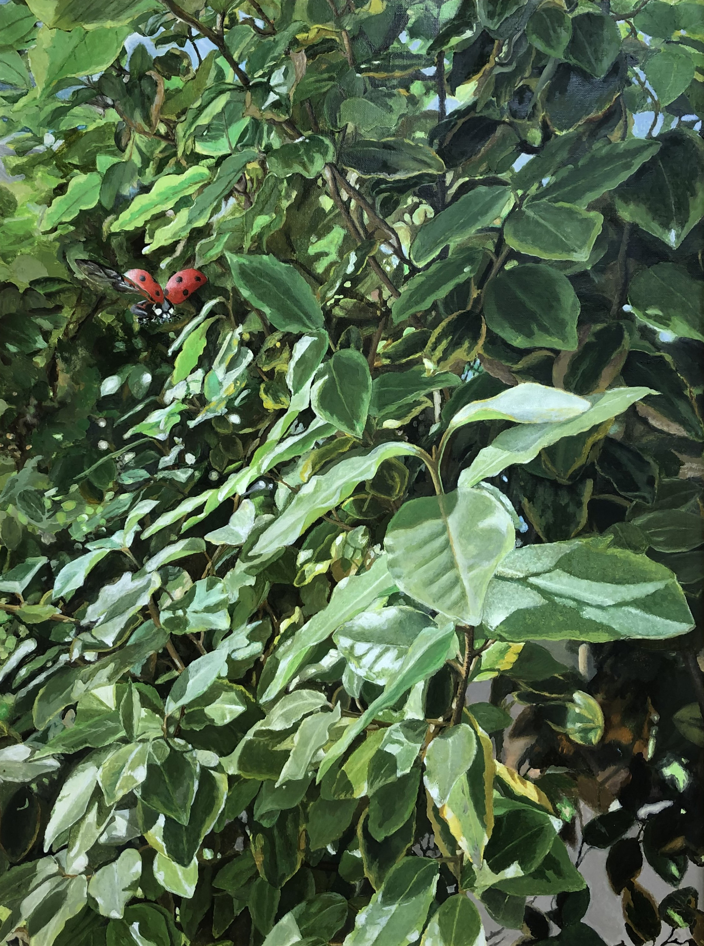 Nestled within the dense foliage, a ladybug ascends into flight, symbolizing fortune and happiness. Its bright coloration stands out against the verdant leaves, emphasizing the importance of the small details that can alter the course of our lives. This artwork reminds us that joy often lies hidden in the simplest of moments, and discovering it requires merely a closer gaze, along with an appreciation for the profound connections that exist among all living beings.
