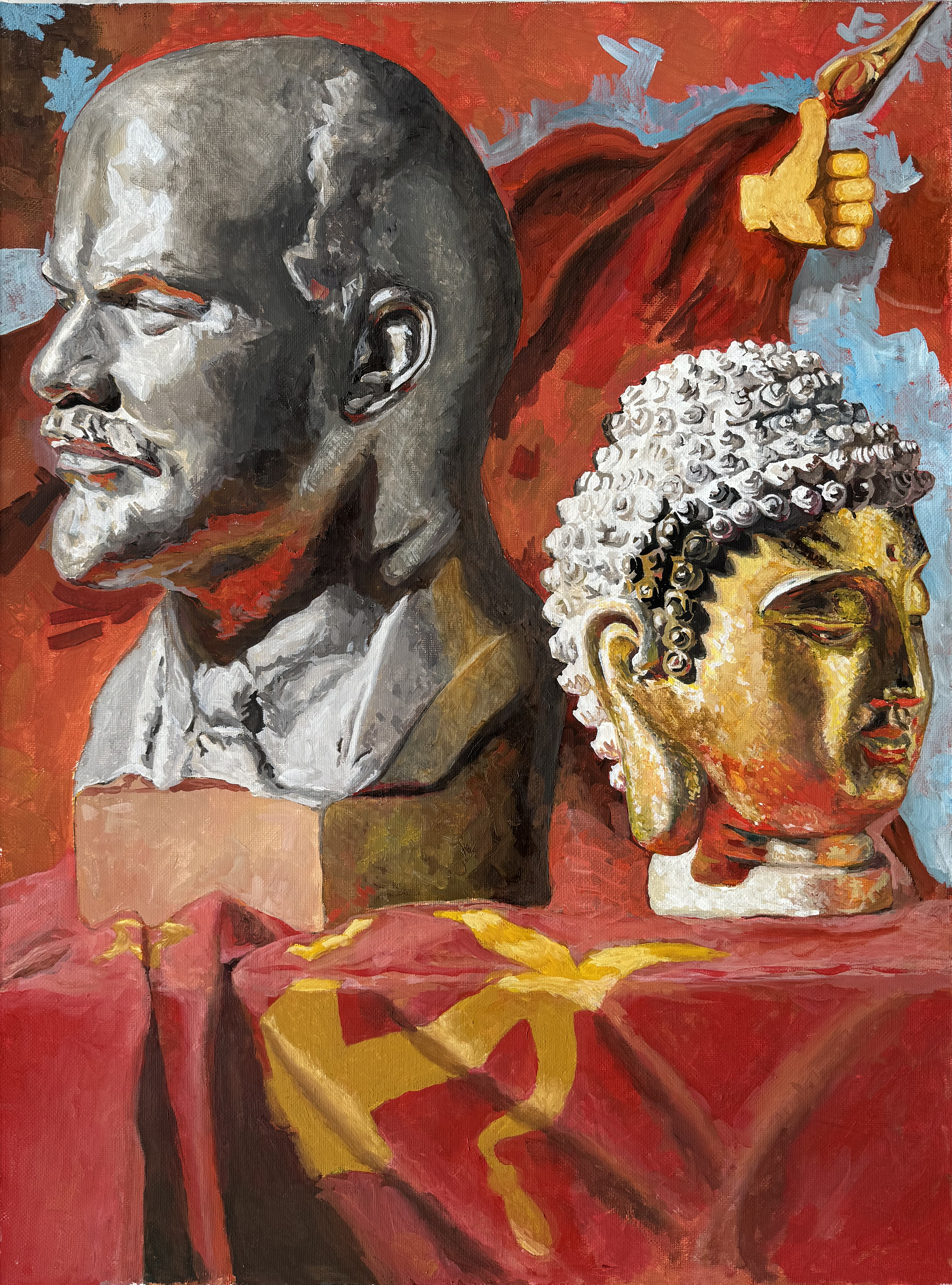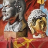 The background bursts with warm reds and oranges, creating a dramatic contrast against the cool marble hues of Lenin and the golden aura of the Buddha. It brims with symbolism: red banners that urge action are woven together with the spirit of tranquility and inner peace that Buddhism embodies. Each detail pulsates with energy, inviting contemplation on the duality of human existence—the ongoing struggle and the pursuit of harmony.