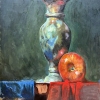 The original piece titled “Vase 2” was created by contemporary Austrian artist Walerij Baranow in 2024 and is available for sale online. This artwork showcases a harmonious interplay of colors that encapsulates both the still life and the essence of life itself. A deep blue backdrop creates an aura of enigma, accentuating the luminous qualities of the graceful vase that catches the light. The warm tones of the orange apple and the red fabric beneath it offer striking contrast and emotional depth.