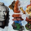 The rich, deep colors of brown and gray that define the bust stand in stark contrast to the gnome's vibrant palette of red, green, and yellow. This interplay creates energy, emphasizing the richness of varied narratives and contexts, as well as the magnificence of authority merged with empathy and concern for the needs of ordinary individuals.