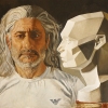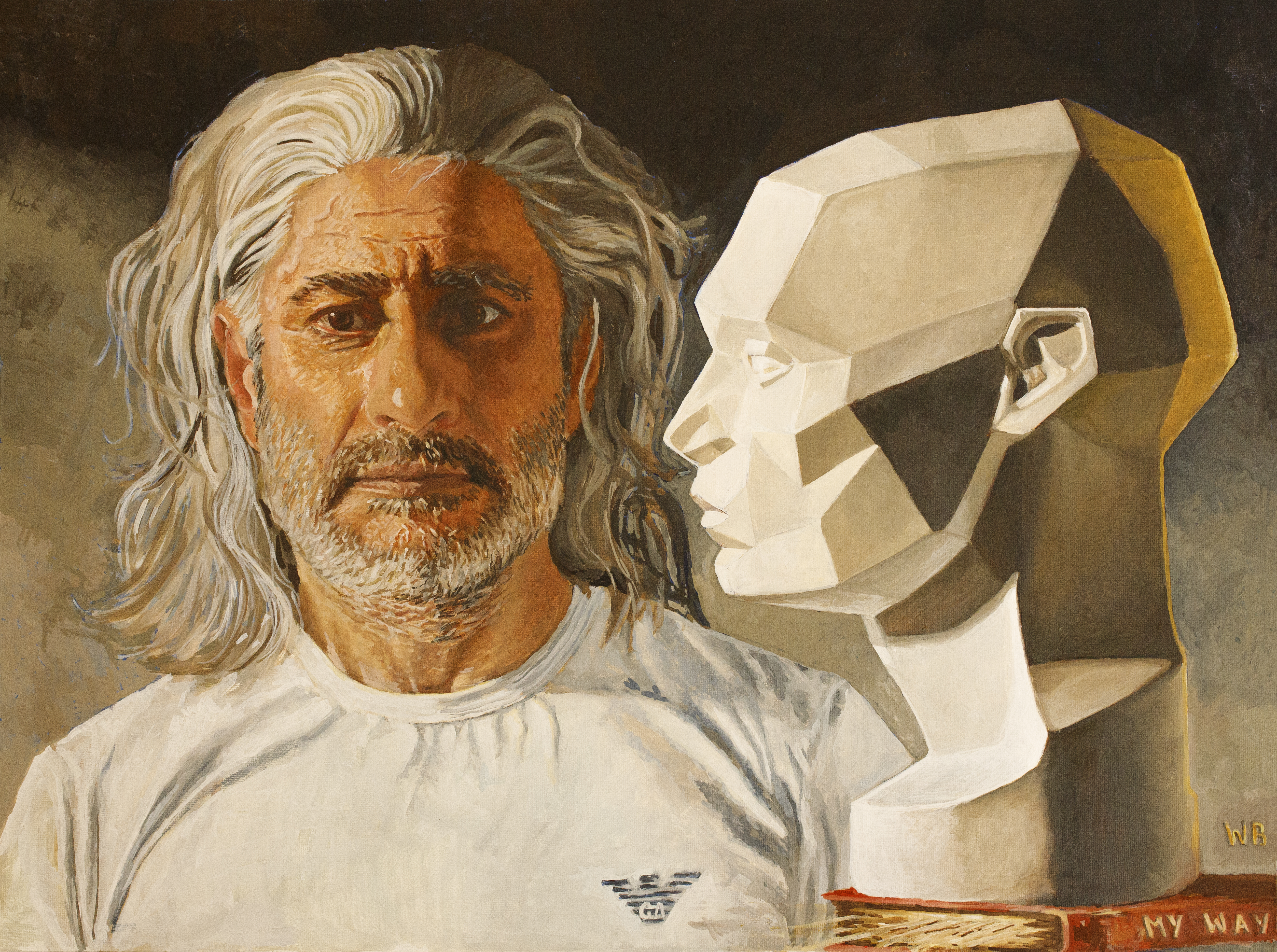 In the artwork, we see a portrait of a man with striking eyes, brimming with resolve and a touch of weariness. His long hair waves like a victory flag, embodying a spirit of freedom despite the burdens of everyday life. The intricately crafted features of his face reflect the depth of character and emotions shaped by years of hard work. Next to him, there is an abstract sculpture symbolizing the inner self, characterized by high intellect, determination, and extraordinary productivity.
