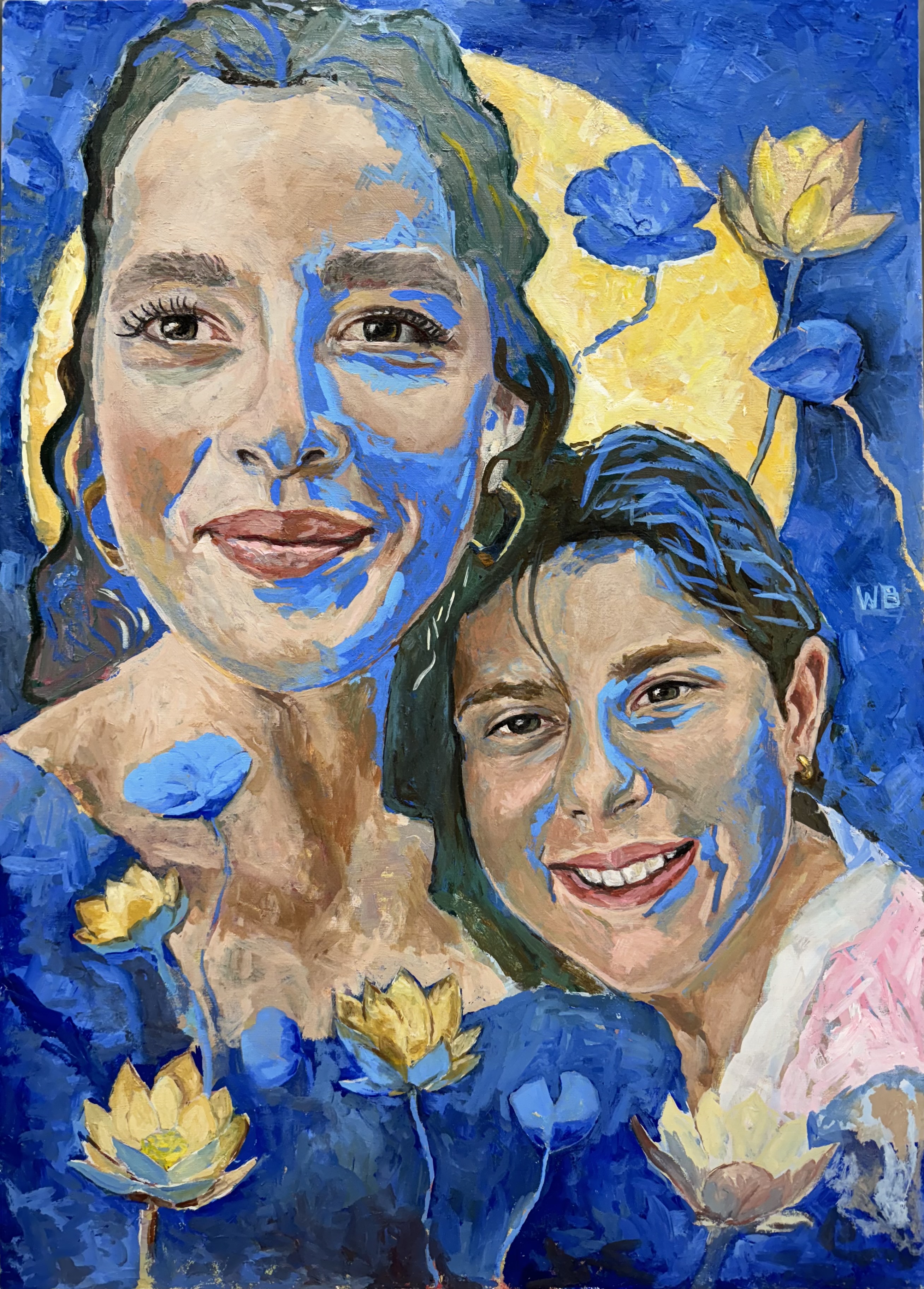 Blue Adelia and Debora" is a touching and deeply personal portrait of the artist's daughters, filled with love and warmth. The central images of the painting are two girls radiating joy, inner light and harmony. The emphasis on blue and gold tones gives the work a special expressiveness, symbolizing spiritual connection, protection and purity.