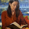 The painting depicts a young woman immersed in reading a book. She is sitting in a cozy pose, dressed in a warm terracotta dress, and on her hand is visible an elegant pearl bracelet. Her face expresses calm concentration and inner harmony, as if the heroine was instantly transported into the world of what she read.