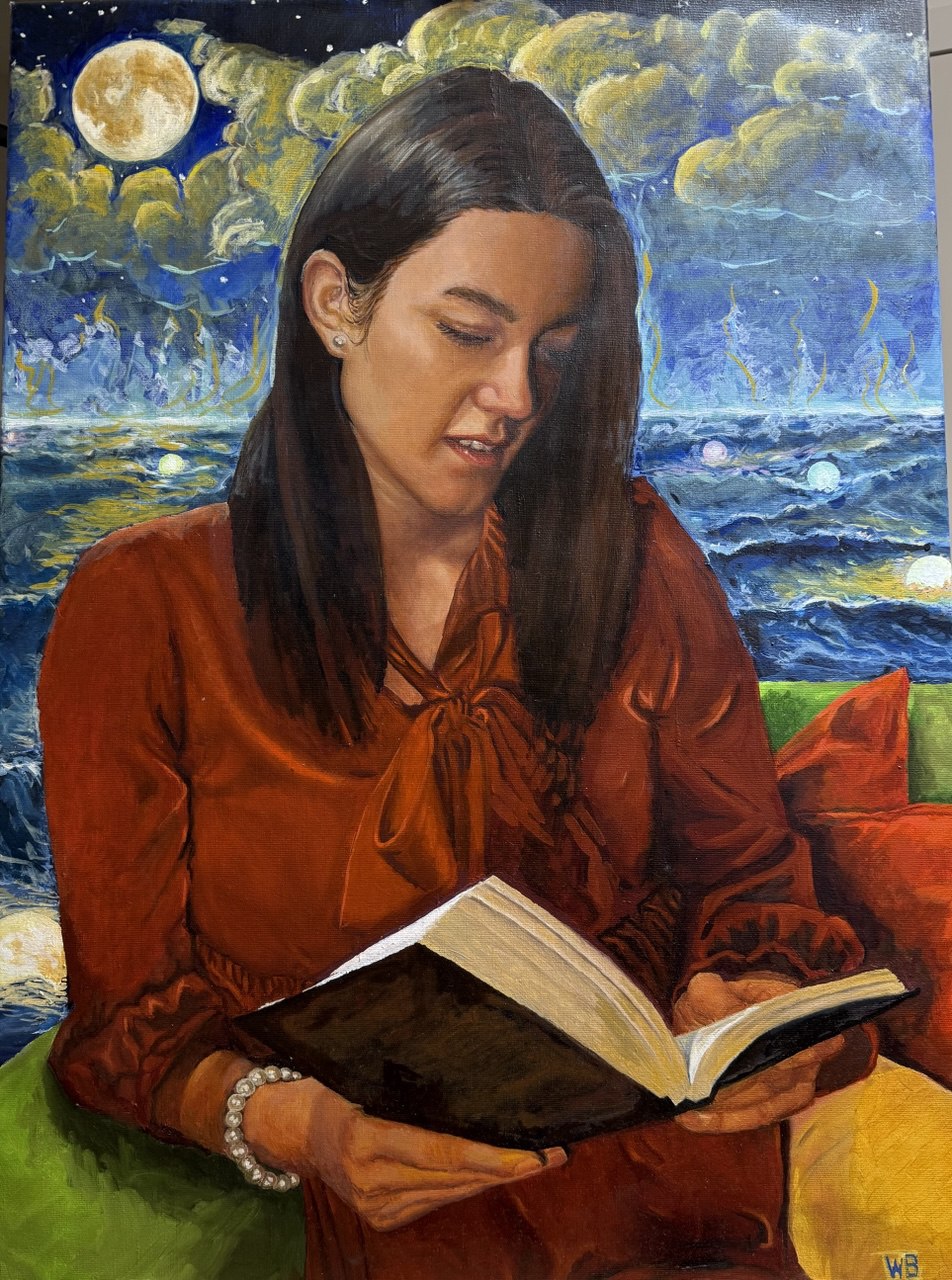 The background for the portrait is a mystical night landscape: the full moon shines brightly in the sky, shrouded in bizarre clouds, and beneath it the sea rages with shimmering flashes of light on the waves, which adds an atmosphere of dreaminess and magic to the picture. The contrast of the soft cozy details of the foreground and the fantastic, almost surreal night elements in the background creates a sense of transition between reality and the world of imagination - as if reading, the heroine of the painting discovers a whole universe of new possibilities and wonders.