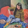 The painting "I am my Creator" conveys a deep meaning of creative self-realization and artistic self-expression. The canvas depicts a young girl in casual clothes - jeans and an olive shirt. In the center of the plot, she is working intently on her work: the viewer sees the artist applying a brush stroke, sitting against the background of draperies made of bright fabrics of a multi-colored palette - blue, green, orange and red.