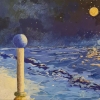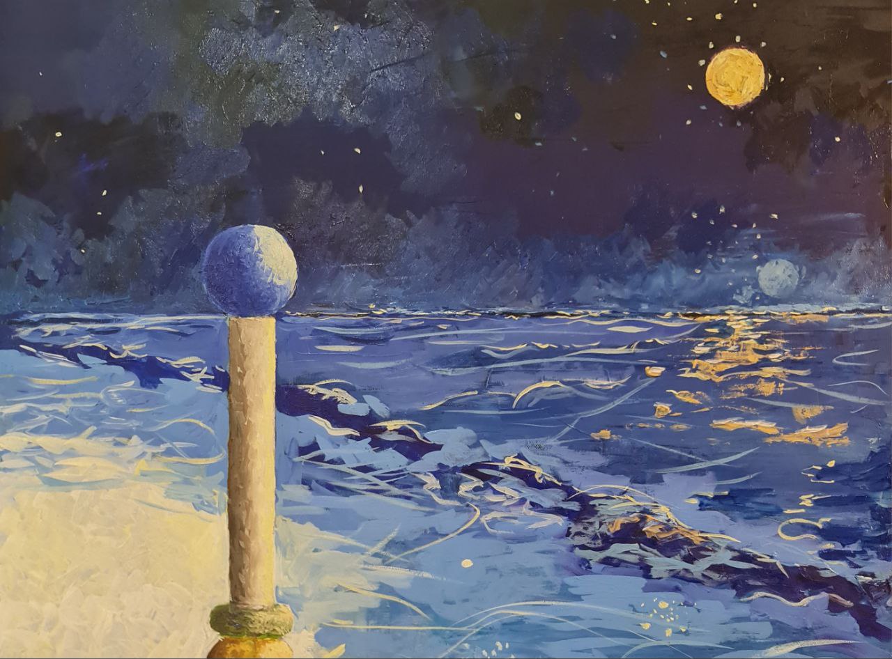 The color palette of the work is saturated with blue, purple and gold tones, creating a balance between the cold calm of space and the warmth of light. The painting evokes a sense of peace and mysticism, inviting each viewer to see in it their own story and interpretation.