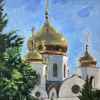 The painting depicts the majestic Alexander Nevsky Cathedral in Krasnodar. The central place is occupied by the massive main dome with a gilded coating, which reflects the sunlight, giving the temple a special triumph and nobility. Nearby, you can see several smaller gilded domes, each of which is crowned with an Orthodox cross.