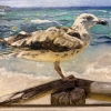 At the center of attention of the painting is a young seagull located on an old wooden structure, as if specially designed for it. Her pose, гордая and независимая, expresses strength, confidence, and freedom. The seagull seems to be a symbol of the sea, wind, and adventures, attracting the eye and inspiring admiration. The artist details the plumage of the bird, conveying its texture, color, and play of light, creating a sense of realism and presence.