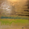 On the golden background, layers of paint in various shades are placed: green, blue, red, brown, and white. These colors are applied with expressive, bold strokes, creating a sense of movement, energy, and possibly memories. The green and blue tones at the bottom of the painting recall nature, earth, and water, while the red and brown hues above may symbolize passion, energy, or autumn landscapes.