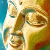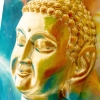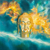 The painting depicts a plaster figure of the Buddha's head mounted on a wooden base painted with oil. The Buddha's head is crafted with meticulous attention to detail: the face radiates calm and serene concentration, the eyes half-closed in a meditative state, and the lips pursed in a slight smile. The plaster surface is painted golden, which is associated with enlightenment, spiritual purity, and nobility.