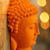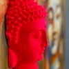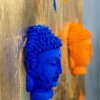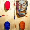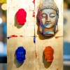 Walerij Baranow's painting is an expressive blend of painting and sculptural forms on a wooden base (plywood). Four Buddha heads are depicted against a gold-plated background, here and there covered with deliberately rough brushstrokes of scarlet and blue paint. Three of them are plaster, painted in rich, pure colors: pink, blue, and orange. Each plaster element casts a noticeable shadow, enhancing the illusion of depth and adding layers to the composition.