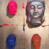 The painting seems to engage in a dialogue between classical Eastern culture—through images of Buddha—and contemporary art, combining different techniques and materials. The abundance of color, the play of textures, and the fusion of the real and the illusory prompt the viewer to reflect on forms of spirituality, identity, and the perception of reality in our time.