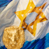 The composition is built on the combination of two key monumental symbols set against a background reminiscent of a waving flag. The background is rendered in white and blue tones, which apparently refer to the flag of Israel.