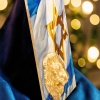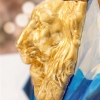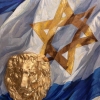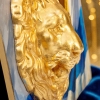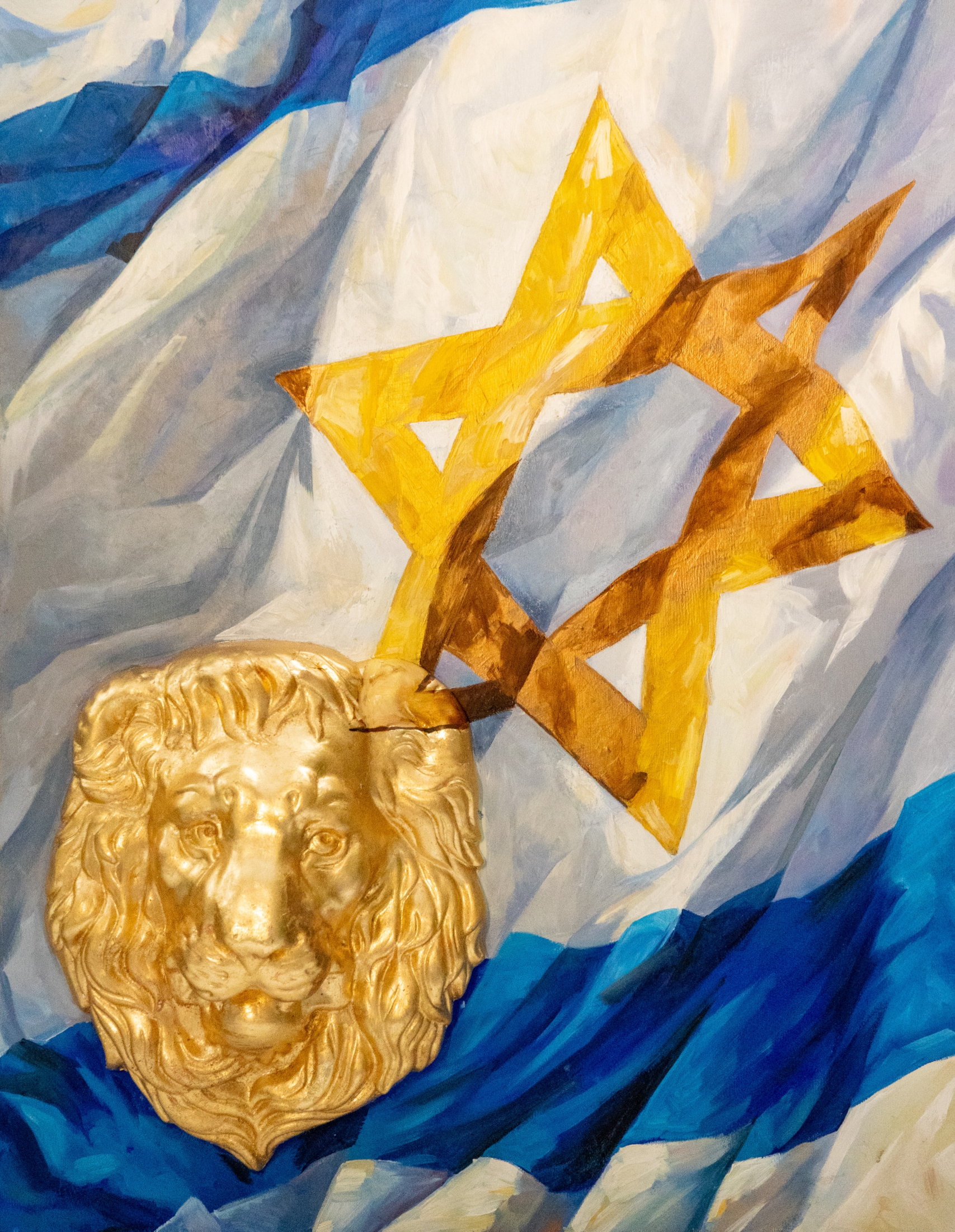 In the lower left corner is a golden bas-relief or sculpture in the form of a lion's head. The lion, traditionally a symbol of Judah and strength, is also made of shiny metal. This lion, adjacent to the Star of David, reinforces the theme of national revival and power.