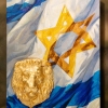 The central element is a large, massive Star of David. It is executed in gold and bronze tones, with a clear mosaic or segmented structure, giving it a physical, tangible weight. The golden color symbolizes grandeur, richness of spirit, and triumph.
