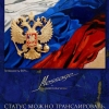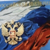 In the background dominates the image of the State Flag of the Russian Federation — the tricolor. The flag is painted dynamically: its cloths flutter in the wind, forming deep picturesque folds. The colors of the flag — red, blue, and white — are bright, rich, and contrasting, giving the image monumentality and solemnity. Part of the flag is hidden behind the relief image, enhancing its role as a powerful background.