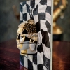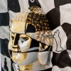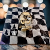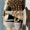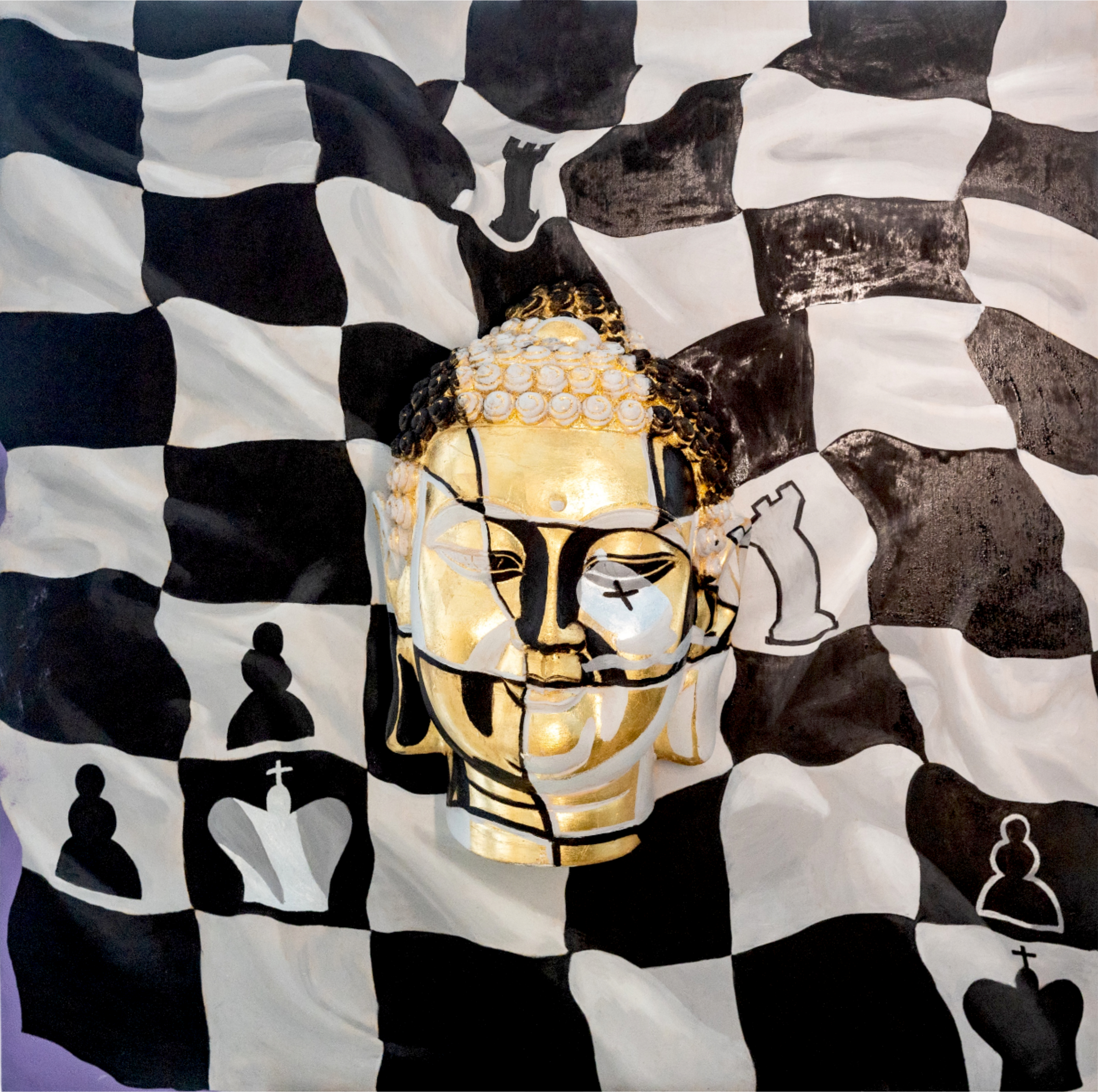 The central element of the composition is a relief image of Buddha’s head, located in the center of the chessboard that covers the entire canvas. The Buddha’s head is made of plaster, covered with gold leaf and oil, giving it a precious, shimmering glow. However, the image of Buddha is not whole: it is divided into fragments, like a mosaic or puzzle. Some parts of the face remain golden, while others are drawn with black and white lines, creating the effect of a complex, multifaceted image. Buddha’s eyes are closed, symbolizing deep meditation and inner peace despite the surrounding “chaos” of the chess game.