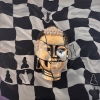 The background of the painting is a chessboard, but not flat; it is wavy, like fabric or a banner fluttering in the wind. The black and white squares of the chessboard are dynamically distorted, symbolizing the unpredictability of life and constantly changing circumstances. Silhouettes of chess pieces are placed on these squares. Some figures are clear, others are translucent or distorted, emphasizing their symbolic rather than literal nature.
