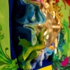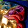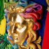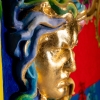 The composition of the painting is a complex collage, with the central element being a relief image of the head of Medusa Gorgon. This head, made of plaster and covered with gold leaf, is placed in the center on a deep blue square and looks like a precious jewel. Its golden shine stands out against the riot of colors.