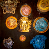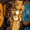The main focus is undoubtedly the central, largest depiction of Medusa. It is made of plaster and covered with gold leaf, giving it a luxurious, metallic shine. This golden Medusa, with her coiled snakes instead of hair, is a powerful and captivating image embodying the grandeur, power, and seduction characteristic of the Versace brand.