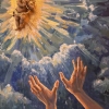 В нижней части картины изображены две реалистично прорисованные руки, протянутые вверх, словно в мольбе или предвкушении. Теплый оранжево-коричневый оттенок кожи резко контрастирует с холодными синими и белыми тонами облаков, подчеркивая земную природу молящегося.