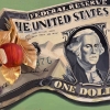 The central element of the composition is a large, distorted one-dollar bill. Its image, painted in oil, appears blurred and warped, as if reflecting the distorted perception of values in a world obsessed with materialism. George Washington, depicted on the bill, looks at the viewer with a certain challenge or perhaps regret.