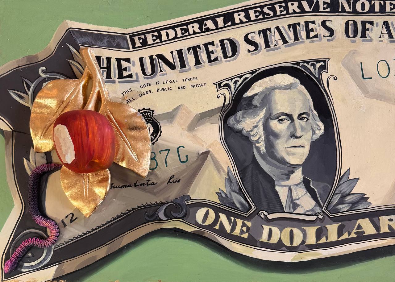 At the top of the painting, above the bill, there is a three-dimensional element – a bitten apple with golden leaves. The apple, a traditional symbol of knowledge, temptation, and the fall from grace, gains a new meaning here. The golden leaves emphasize its value but at the same time make it artificial, alluding to the idea of consumption and the thirst for possession. This may symbolize how capitalism distorts natural values, turning them into objects of speculation and accumulation.