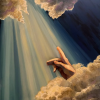 The focal point is a hand reaching out from the clouds, but instead of a gesture granting life, we see a moment of fading hope. The hand, as if dissolving in soft light, is frozen in search of contact that never happens. Rays of light piercing the space, instead of divine warmth, emit cold detachment. The contrast between the illuminated cloud mass and the deep darkness on the right creates a sense of an abyss where meaning fades away.