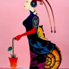 Her dress is decorated with colorful patterns, and instead of legs - a large snail shell with a mosaic sheen, against which the yellow wings of a butterfly stand out effectively. In her outstretched hand, the woman holds an exotic flower, lowered to the ground, as if it were a magic umbrella. Red gloves and an elegant profile emphasize the mystery and elegance of the unearthly heroine.