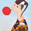 A large scarlet bubble comes out of the character's mouth, reminiscent of both an inflatable balloon and a fruit, which brings an element of lightness and play to the composition. The ear is decorated with a fancy earring with a miniature portrait of a bird, and the temple area is decorated with multi-colored flowers, like a mosaic of flowers and fantasy patterns.