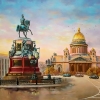 На картине старейшая и красивейшая Исаакиевская площадь осенью с ее переменчивой погодой. Центр площади – это уникальный 16-метровый монумент Николаю 1 (1859 года), опирающийся всего на 2 точки и украшенный скульптурами Силы, Мудрости, Веры, Правосудия (4 женских изваяния). Но главное место площади занимает величественный действующий Православный Собор (101,5 м высотой), построенный в 1818-1858 годах в честь святого покровителя Петра Великого Исаакия Далматского. На площади возведены в течение трех столетий в разное время: Мариинский дворец (здесь расположено городское Законодательное собрание), Германское посольство, дом князя Лобанова-Ростовского, гостиница "Астория", дом Исаакия, дом Мятлевых, Синий мост, сквер и… самые красивые фонари С-Петербурга. Все архитектурные достопримечательности гармонично сосуществуют на Исаакиевский площади и создают неповторимый исторический ансамбль. Картина будет прекрасно смотреться в гостиной, в спальне, в офисе и в современном интерьере