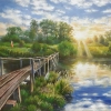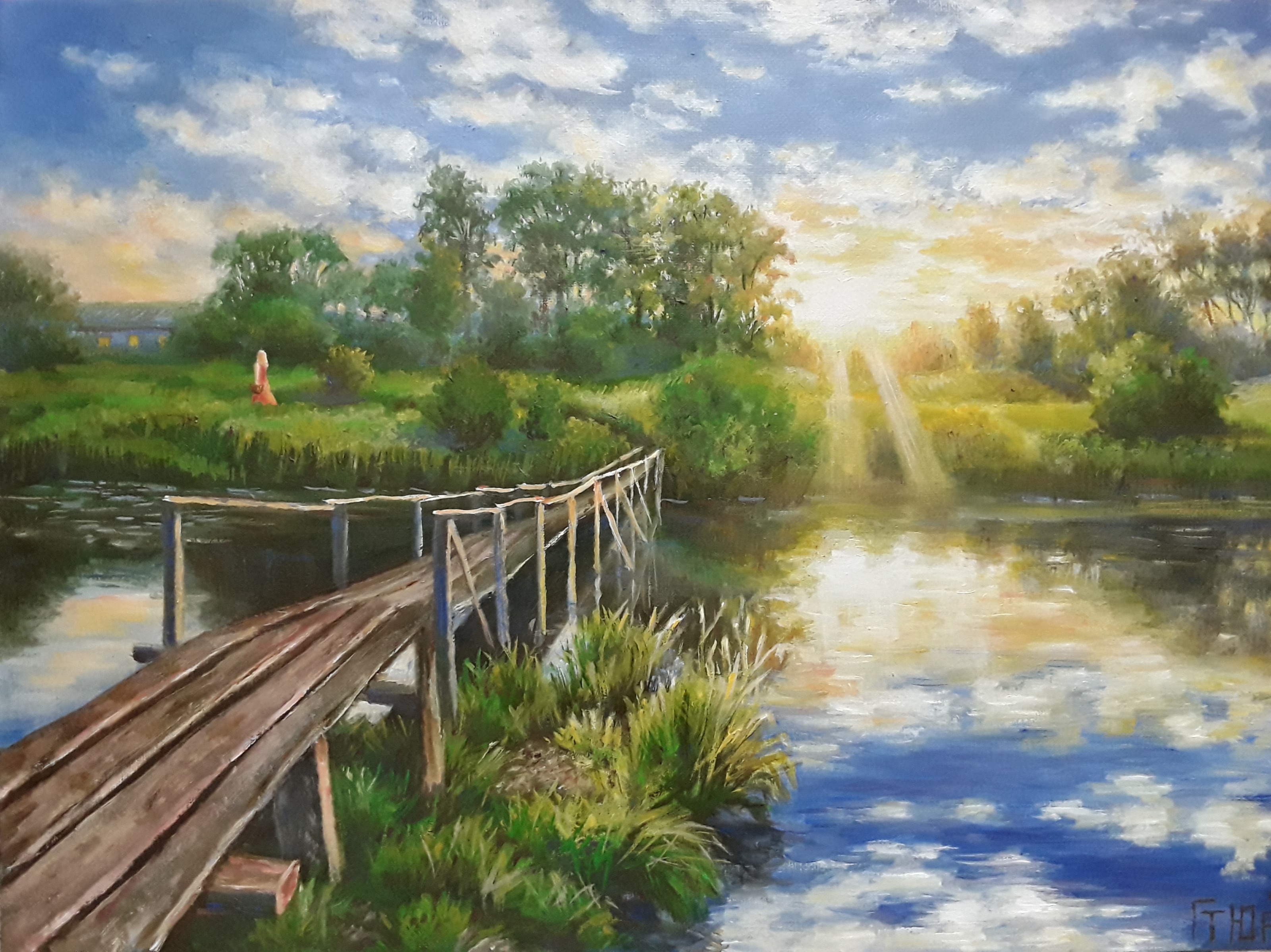 The painting is filled with radiance, silence, and tranquility! The water in the river lies like a canvas in a frame. The little bridge connects the banks like a ribbon—the left bank, the right bank. The fading glow of a long day delights with its beauty. The painting feels like a memory from childhood, creating a sense of presence! It is a portal to summer, to a world where there is room for the Beautiful!