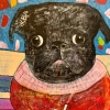 The animal's clothing attracts special attention: the pug is dressed in a colorful sweater with a patterned ornament and a wide pink neck. This outfit gives the painting irony and emphasizes the individuality of the character, turning an ordinary pet into an almost human figure. The dog holds a small object in its front paws, which adds additional mystery to the scene and associations with peaceful characters of portrait painting.