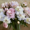 The painting depicts an exquisite bouquet of peonies in a transparent glass vase. The lush flowers are dominated by white and soft pink shades, their petals look airy and fragile, as if filled with summer light. In the center of the bouquet, open flowers softly shimmer with each other, creating a play of warm and cold shades.