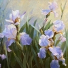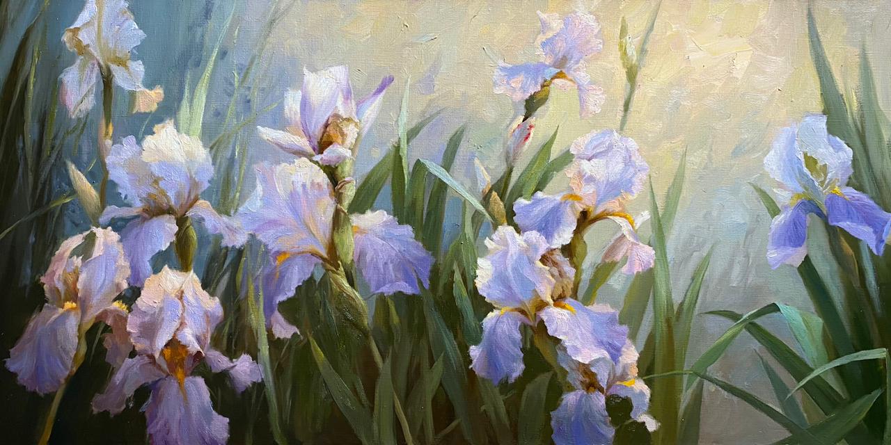 The painting depicts a wonderful corner of a summer garden, filled with light and freshness. In the foreground, thin stems and delicate petals of blooming irises rise. Their airy, light blue and lilac flowers, slightly illuminated by golden sunbeams, create a feeling of lightness and fragility.