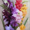 The painting depicts a lush bouquet of gladioli, which amazes with the variety of colors and grace of lines. The flowers are collected in a high composition, where bright purple, lilac, violet, red, yellow and white gladioli harmoniously combine with each other, creating a rich and vibrant color spot.