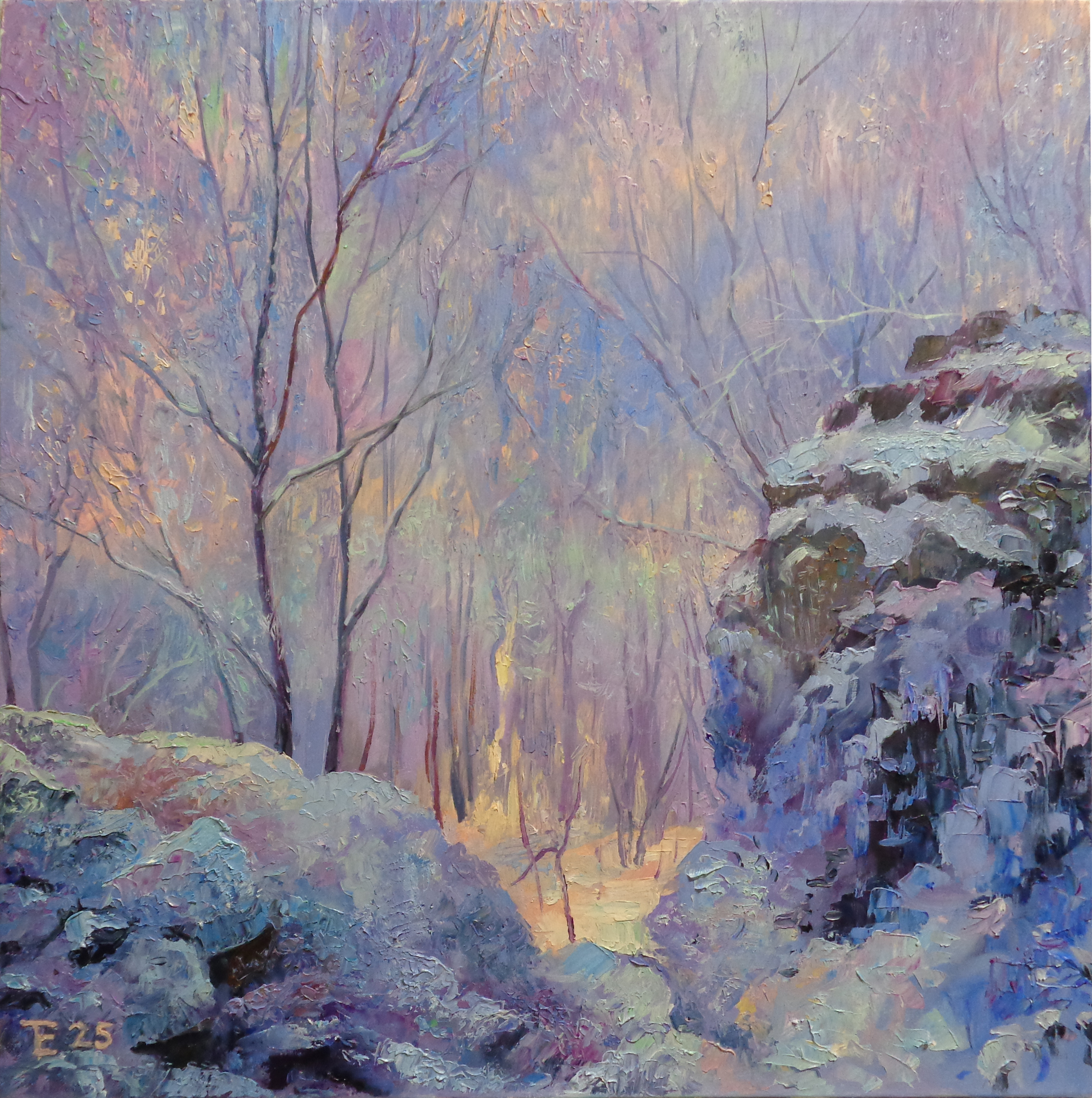 This work conveys the magic of a winter forest bathed in the first rays of the sun. In the foreground we see massive rocks covered with frost and thin tree branches, creating a sense of fragility and sophistication. The palette of shades varies from delicate purple to golden and pinkish tones, as if the sunlight plays with all the colors of the rainbow. The depth of the painting is achieved through the masterful depiction of the morning light penetrating the tree and nature hidden in the darkness. The painting evokes a feeling of silence and peace, as if the forest is dozing at the junction of night and day.