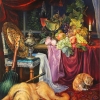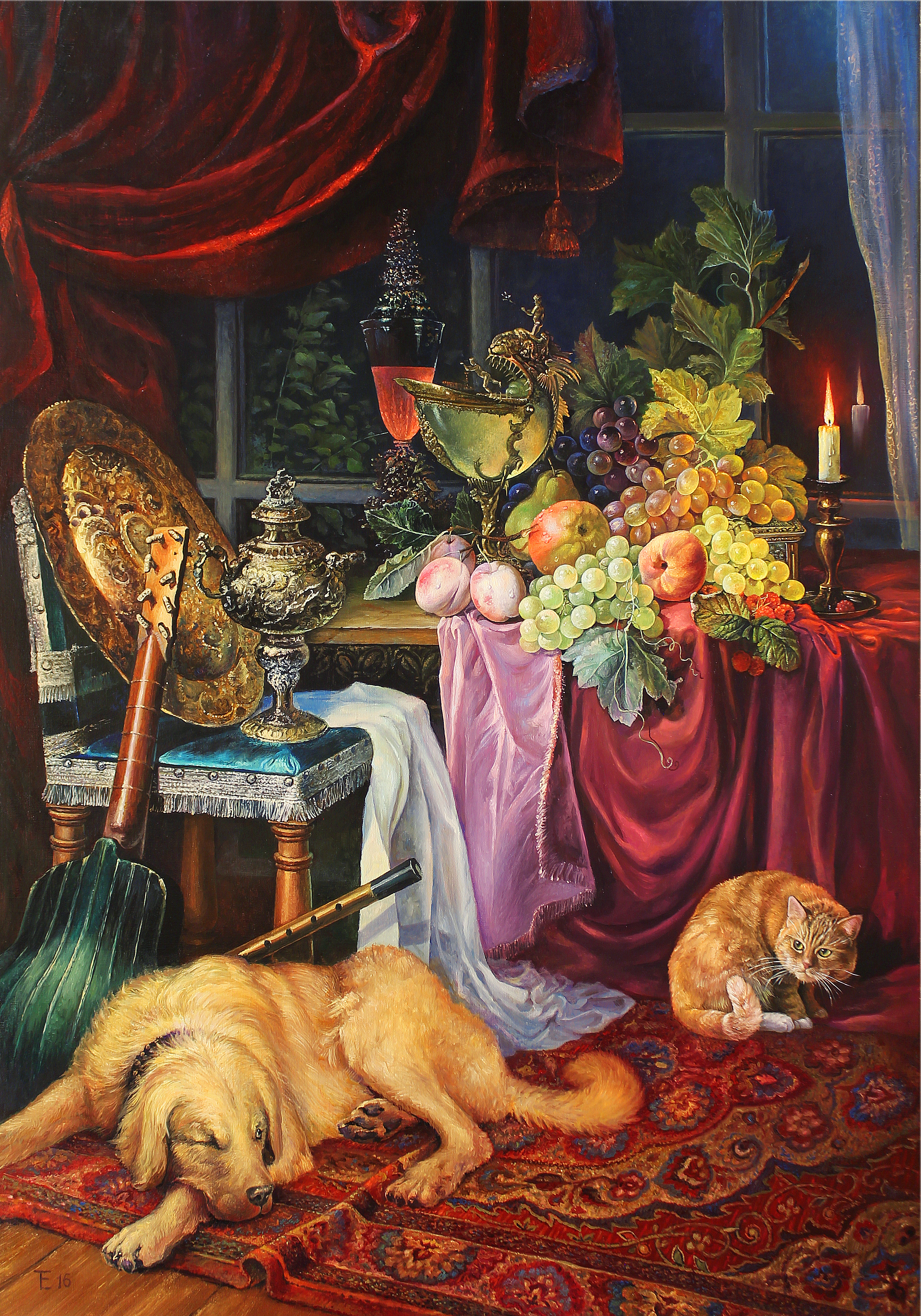 This meticulously crafted painting depicts a rich still life that hints at the atmosphere of the Baroque era. The scene takes place in the warm comfort of a room. On the table is an abundance of fruit: bunches of grapes, peaches, and goblets made of precious metals. In the foreground is an old lute and a dog dozing peacefully on a bright carpet. In the background, under soft curtains, a candle illuminates a night window through which greenery can be seen. Every detail of the painting speaks of homeliness, luxury, and peace. The work of light and texture creates a sense of real tangibility of the scene.