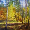 This work is an ode to the beauty of autumn. Slender birch trees stand in the foreground, their snow-white trunks rush upward, surrounded by golden, orange and red leaves. The continuation of the forest draws the gaze into the depths, where the light of the autumn sun breaks through the foliage, creating soft and warm highlights. Small mushrooms are visible on the ground, the red dots of which complement the rich palette. This painting emphasizes the feeling of coziness and brightness of autumn nature, immersing the viewer in the calm and peaceful world of the forest.