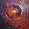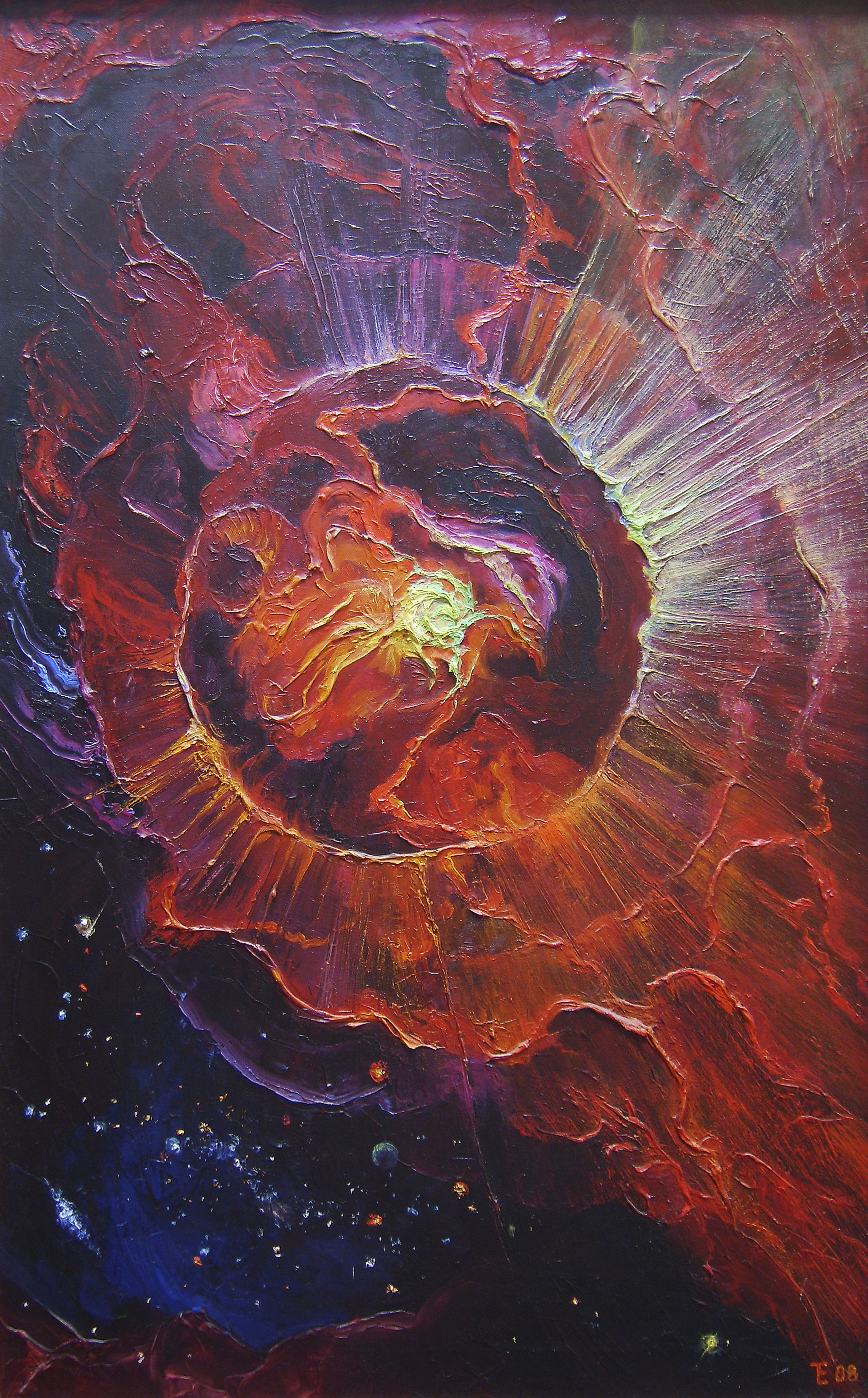 This abstract work transports the viewer to the starry distances. In the center of the composition is a spiral shape, reminiscent of the birth of a galaxy or a star, as if a bright and energetic explosion of light gives birth to new life. Cool blue and purple shades of the background emphasize the infinity of the Cosmos, and the red-orange palette of the central part attracts the eye with its dynamism and power. Small stars are scattered along the edges of the painting, creating the impression of a boundless universal space. The painting seems to show the life of the Universe in its original form - a volcano of energy and power.
