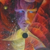 This work is a complex combination of abstract and portrait art, with a face at the center surrounded by symbolic elements. The expression is enigmatic: sunken eyes with a cold blue glow enhance the feeling of the supernatural. Red and gold lines radiating from the central element are reminiscent of the spirals of galaxies or the passage of time. In the foreground is a round dark object, symbolizing either a black hole or a portal to another dimension. The painting evokes a sense of mystery, combining elements of space, time and humanity.