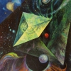 This expressive work combines space themes with elements of abstraction. In the center of the composition is a large translucent crystal, shimmering with green and yellow hues, as if receiving light from within. The background of the painting is filled with galaxies, stars and vortices of cosmic energy, creating a sense of endless movement. The atmosphere is intensified by strong contrasts - a deep shadow at the bottom of the work enhances the drama. This painting evokes a mysterious sense of connection between the earthly and the extraterrestrial, emphasizing the power of the unknown and the attraction of the unexplored.