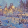 This winter landscape captures the coziness and silence of a winter evening in the countryside. The viewer is treated to a snow-covered courtyard, shrouded in bluish twilight. On the right side of the painting, against the backdrop of trees, warm lights from street lamps are visible, softly dispersing through the branches, creating golden highlights on the snow. The cozy house on the left, decorated with icicles, seems full of warmth, and the light in the window is a symbol of home comfort. The moon in the sky and the bluish shadows from the trees on the snow create a sense of peace and fairytale. In the foreground, a fence, bushes in the snow, and a small cat are visible, adding lively details to the painting.