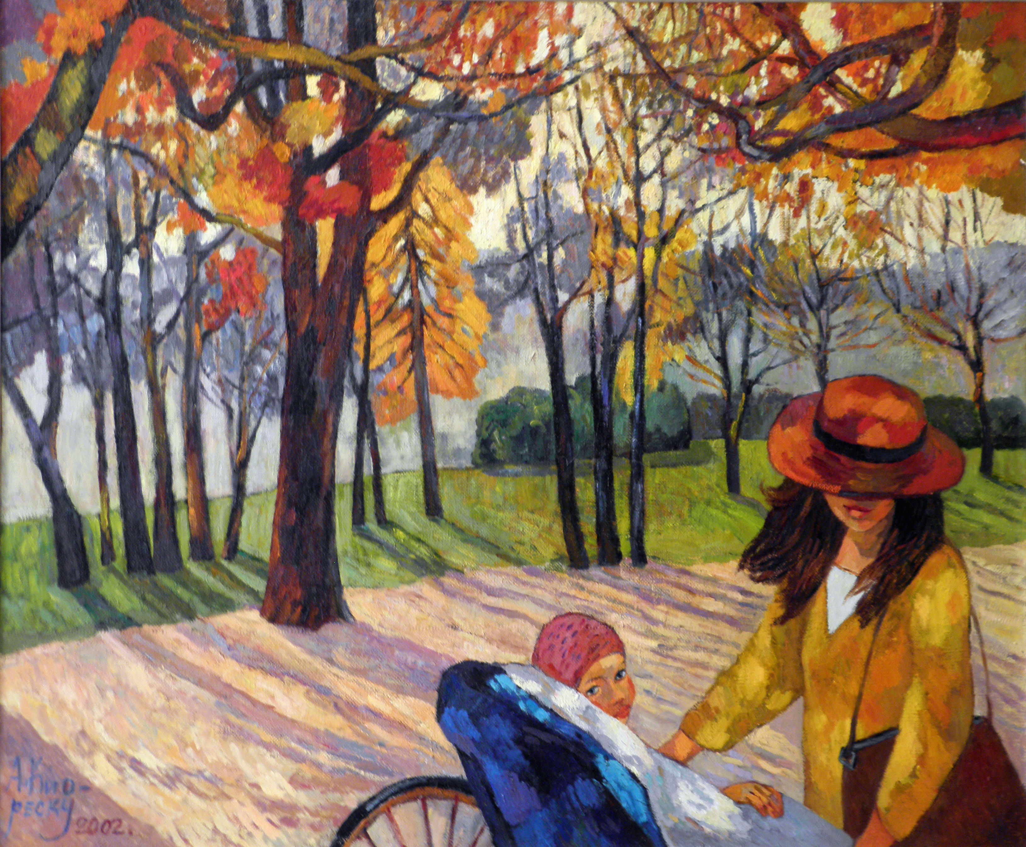 Original painting for sale online “Walk in the Autumn Garden”, created by contemporary Russian artist Andrey, painted in 2002.