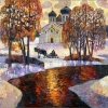 Further, behind the river, a snow-covered landscape stretches out. In the center of the composition, like a beacon, rises a church with dark domes reaching into the sky. It symbolizes faith, spirituality, and connection to the past. To the left and right of the church grow trees whose branches, devoid of foliage, form bizarre patterns against the sky.