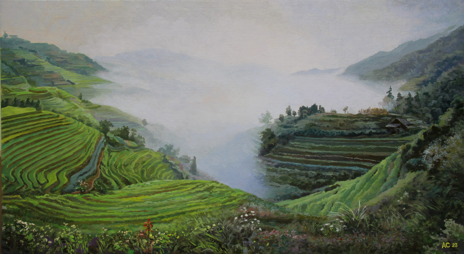 Original unique painting. Canvas on hardboard. China, rice terraces.