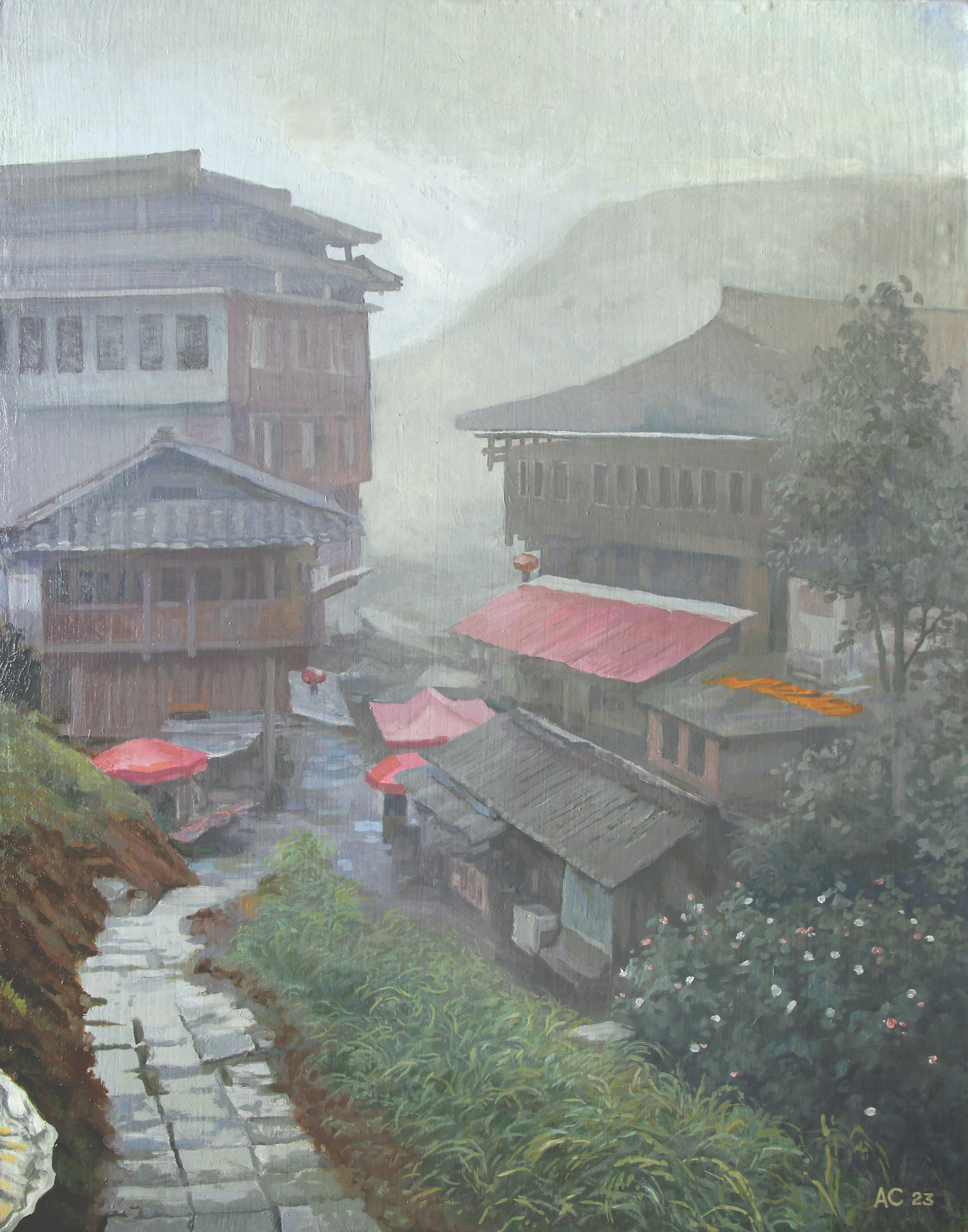 Original oil painting. Canvas glued onto hardboard. The painting depicts the Chinese village of Ping'an, in the area of the rice terraces.