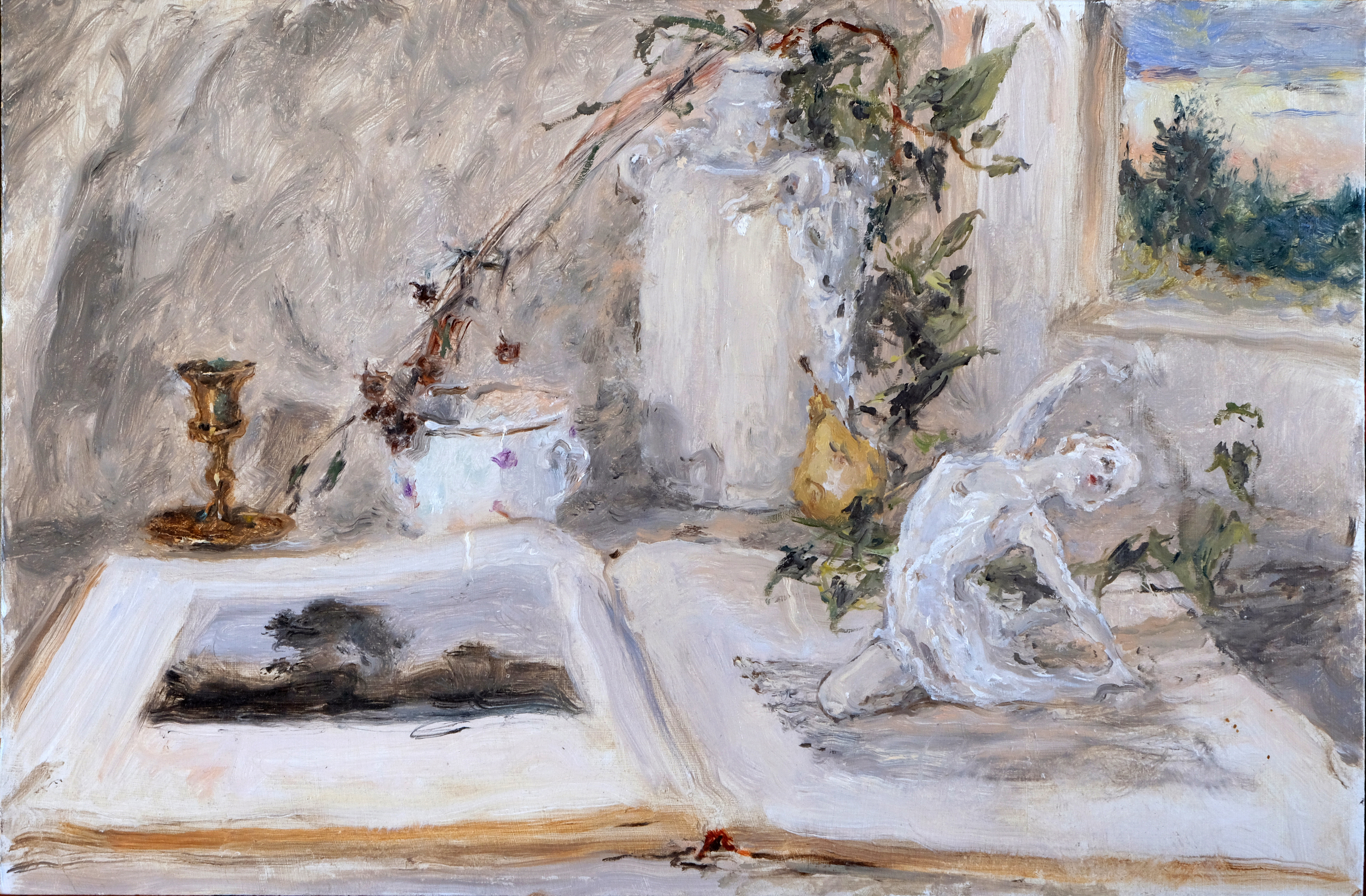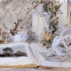 This intimate composition combines melancholic details and creates a deep atmosphere of reflection. The focus is on an open book and a miniature statue of a dancer, as a symbol of impulse and inspiration. The branches of withering plants and an empty candlestick complement the mood of a bygone era. The light streaming from the window beautifully emphasizes the subtlety of textures: the marble of the white jug, the rough weave of the pages and the variability of soft halftones on the dry leaves. The painting seems to invite a conversation about memory, creativity and the brevity of life, while maintaining a deep artistic harmony.