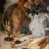 This painting is a subtle allegory of the search for one's own "I". The central part of the composition is the reflection of a woman in an antique mirror, as if hidden among a lush bouquet of flowers and the soft glow of a burning candle. The fabrics on the table, soft brushstrokes and muted reflections of light create a rich textured picture. The reflection in the mirror is blurred and illusory, as a symbol of the ephemerality of the inner world, wrapped in mystery. The painting immerses one in thoughts about the past, time and the fleeting beauty of life.