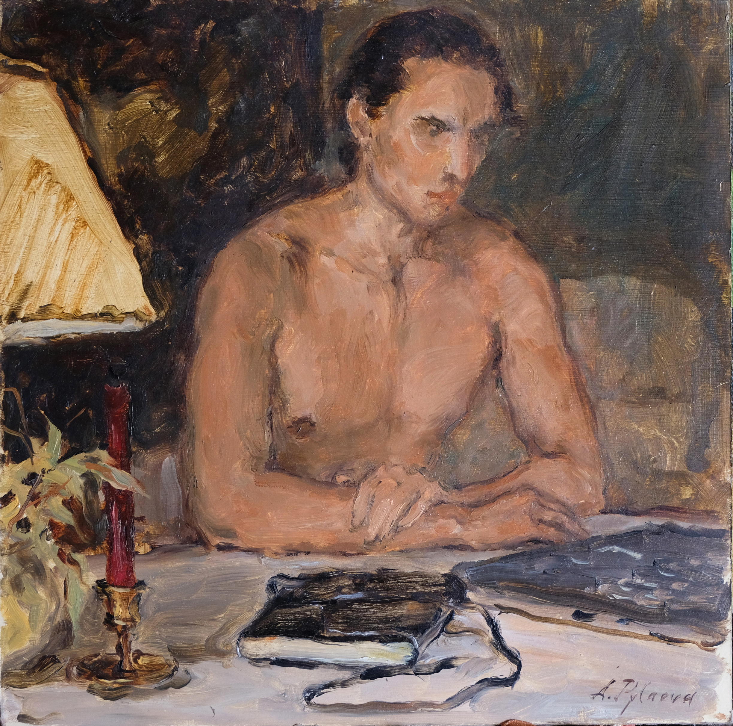 The portrait embodies a thoughtful inner world of monochromatic depth. A man with a naked torso sits at a table, leaning on his hands, immersed in thought. The warm light of the lamp outlines his face and body, creating smooth transitions of shadows. Books and papers are visible on the table, which symbolizes the process of self-knowledge or the search for inspiration. The painting is done in a warm, brown range, creating coziness, despite the seriousness of the hero's expression.